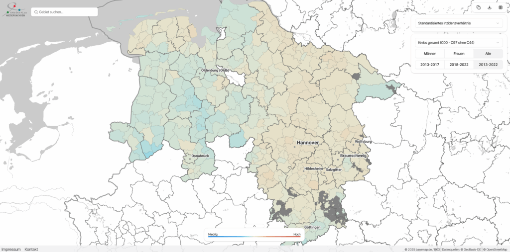 Der Krebsatlas bietet einen Einblick in die kleinräumige Verteilung von Krebserkrankungen in Niedersachsen. Auf Ebene der Gemeinden Niedersachsens wird kartografisch die Häufigkeit für 23 Krebserkrankungen und Krebs gesamt dargestellt.
