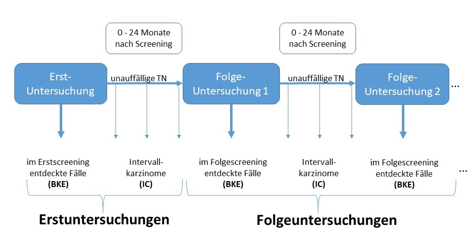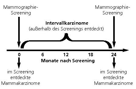 Intervallkarzinome sind eine sehr heterogene Gruppe von Karzinomen, die in einem Screeningprogramm unvermeidbar sind. Das Zeitfenster, in dem diese auftreten können, geht aus Abbildung 6 hervor.