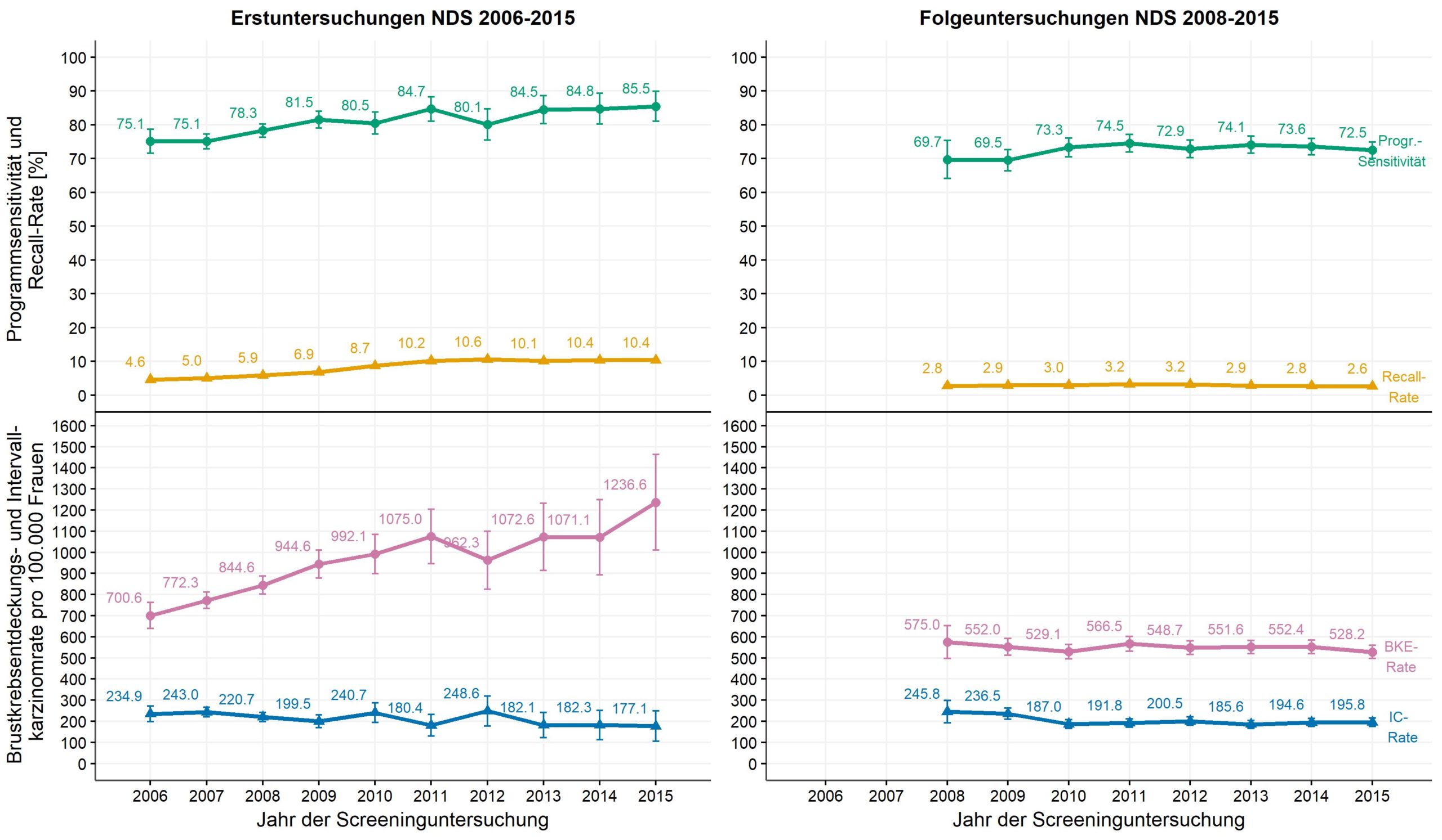 Für Erstuntersuchungen (s. Abbildung 4, linke Grafiken) zeigen die altersstandardisierten Ergebnisse, dass der stetige Anstieg der BKE-Rate auf inzwischen 1.236 je 100.000 Erstuntersuchungen (2015) in den letzten Jahren nur noch mit einem moderaten Rückgang der IC-Rate einhergeht (2015: 177 je 100.000). Auch die rohe Recall-Rate ist im zeitlichen Verlauf angestiegen von 4,6% (2006) auf 10,4% (2015) – nach Auskunft des Referenzzentrums Mammographie Nord ist dies auf eine sensitivere Diagnostik sowie auf die Abnahme des Durchschnittsalters der Erstteilnehmerinnen zurückzuführen. Die Programmsensitivität liegt für das Screeningjahr 2015 bei ca. 86%.