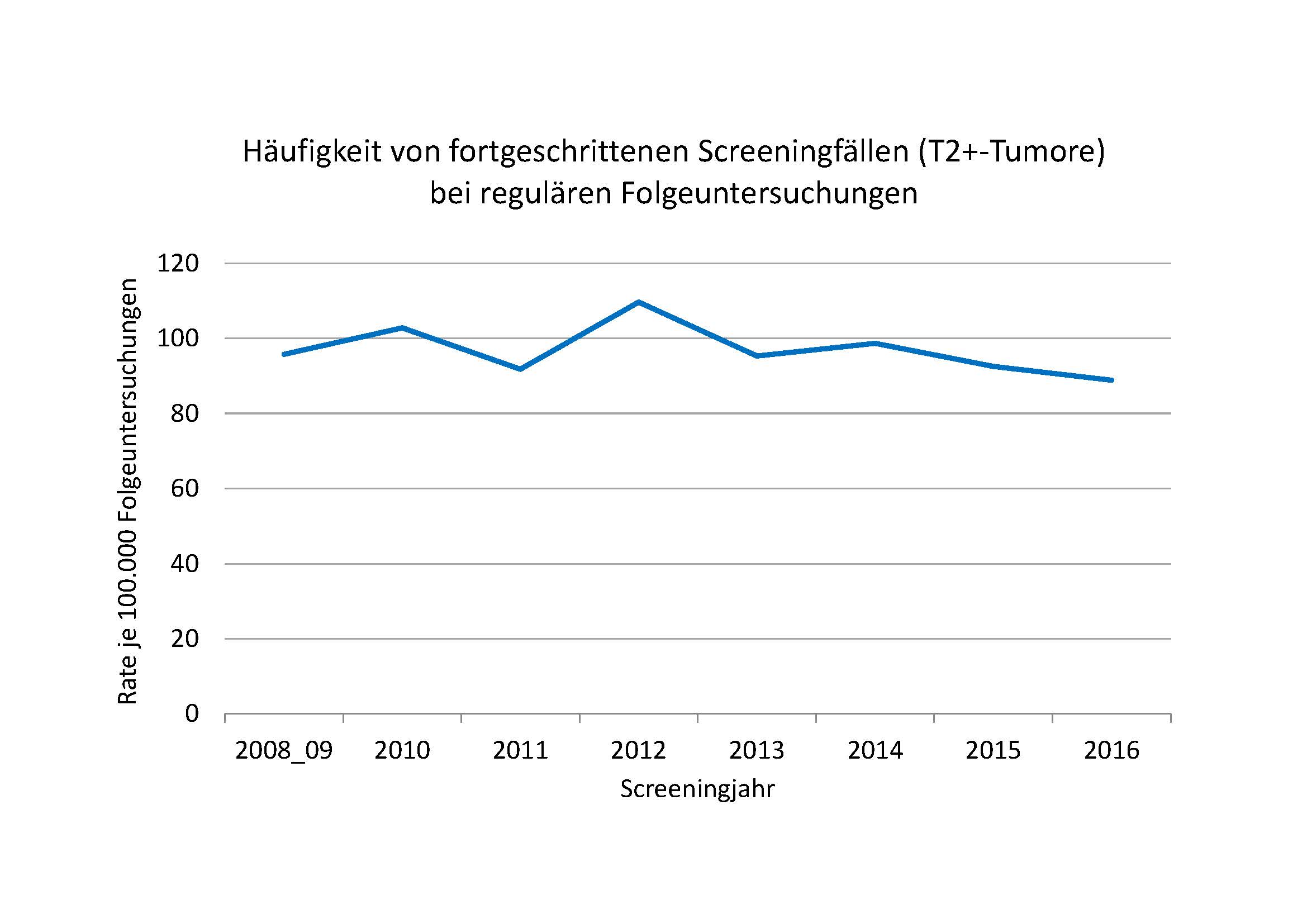 Gemittelt über die Screeningjahre 2008 – 2016 ist bei ca. 97 je 100.000 reguläre Folgeuntersuchungen ein fortgeschrittener T2+-Tumor befundet worden. Die Rate ist im zeitlichen Verlauf etwas gesunken – von 96/100.000 in den Jahren 2008 – 2009 auf 89 je 100.000 im Jahr 2016. Es ist anzunehmen, dass es sich bei diesen fortgeschrittenen Karzinomen zu einem großen Anteil um schnell wachsende Tumore handelt, die sich zwischen den beiden Screeninguntersuchungen neu entwickelt haben. Dem Referenzzentrum Mammographie Nord wurden die Ergebnisse – differenziert für alle Screeningeinheiten – zum Zweck der weiteren Qualitätssicherung zur Verfügung gestellt.