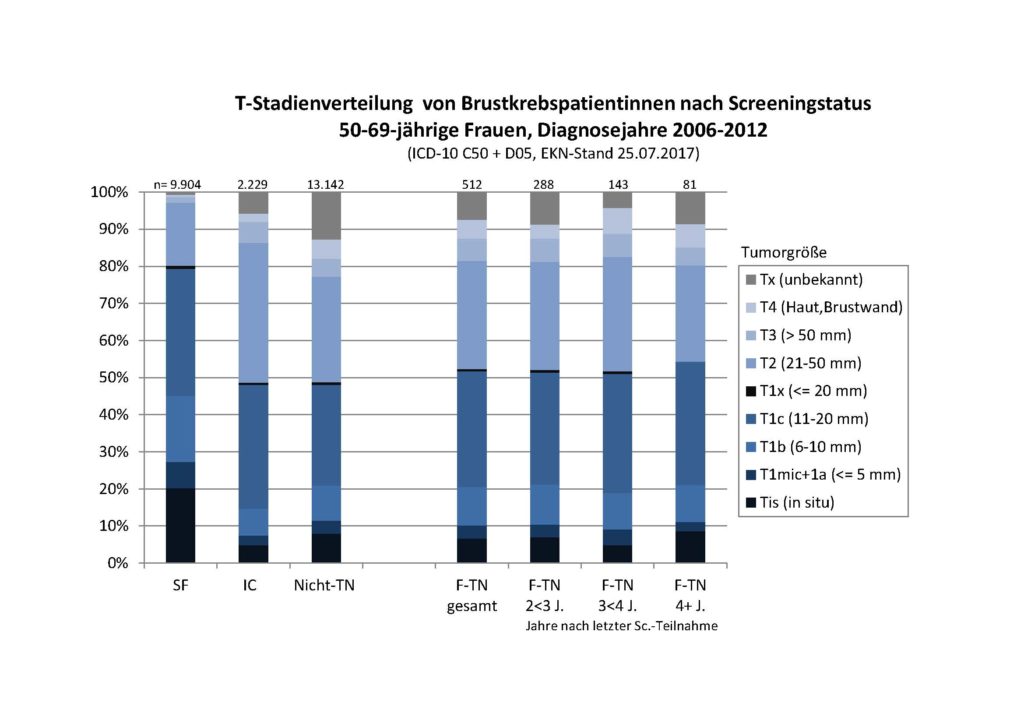 Der Datenabgleich aller Screeningteilnehmerinnen (TN) mit dem Krebsregister ermöglicht es, auch die Brustkrebsfälle der Nicht-Teilnehmerinnen (Nicht-TN) im Krebsregister zu ermitteln. In einer im Jahr 2017 durchgeführten Analyse (pdf, 187 KB) wurde die T-Stadienverteilung von Screeningfällen, Intervallkarzinomen, Fällen von Nicht-Teilnehmerinnen sowie früheren Teilnehmerinnen des MSP verglichen (Poster EKN 2017).