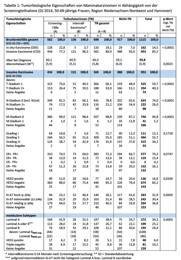 Methodik: 953 invasive Mammakarzinome von 50-69-jährigen Frauen mit Wohnort in den Screening-Regionen Hannover und Niedersachsen-Nordwest (n = 285.634 anspruchsberechtigte Frauen) kommen zur Auswertung. Die Gruppe der TN umfasst sowohl Screeningfälle als auch Intervallkarzinome, die bis 24 Monate nach unauffälligem Screening auftraten. Als Tumore der Nicht-TN gelten alle Mammakarzinome, die keiner TN zugeordnet wurden. Alle Mammakarzinome werden den modifizierten intrinsischen Subtypen der S3-Leitlinie zugeordnet.
