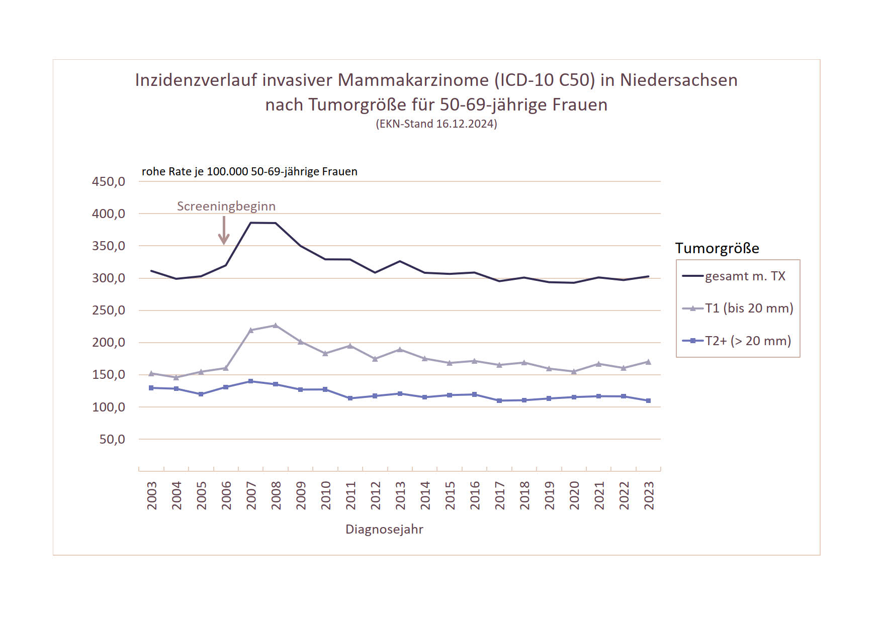 Die bevölkerungsbezogene Inzidenz für Brustkrebs wird stark vom organisierten Mammographie-Screening-Programm beeinflusst. Für invasive Brustkrebserkrankungen bei 50-69-jährigen Frauen zeigt sich während der Aufbaujahre des Screeningprogramms (2005-2008) ein deutlicher Inzidenzanstieg. Bis 2014 sinkt die Inzidenz wieder und liegt seitdem in etwa auf dem Niveau der Ausgangsinzidenz vor Beginn des Screenings (s. Abbildung 1).