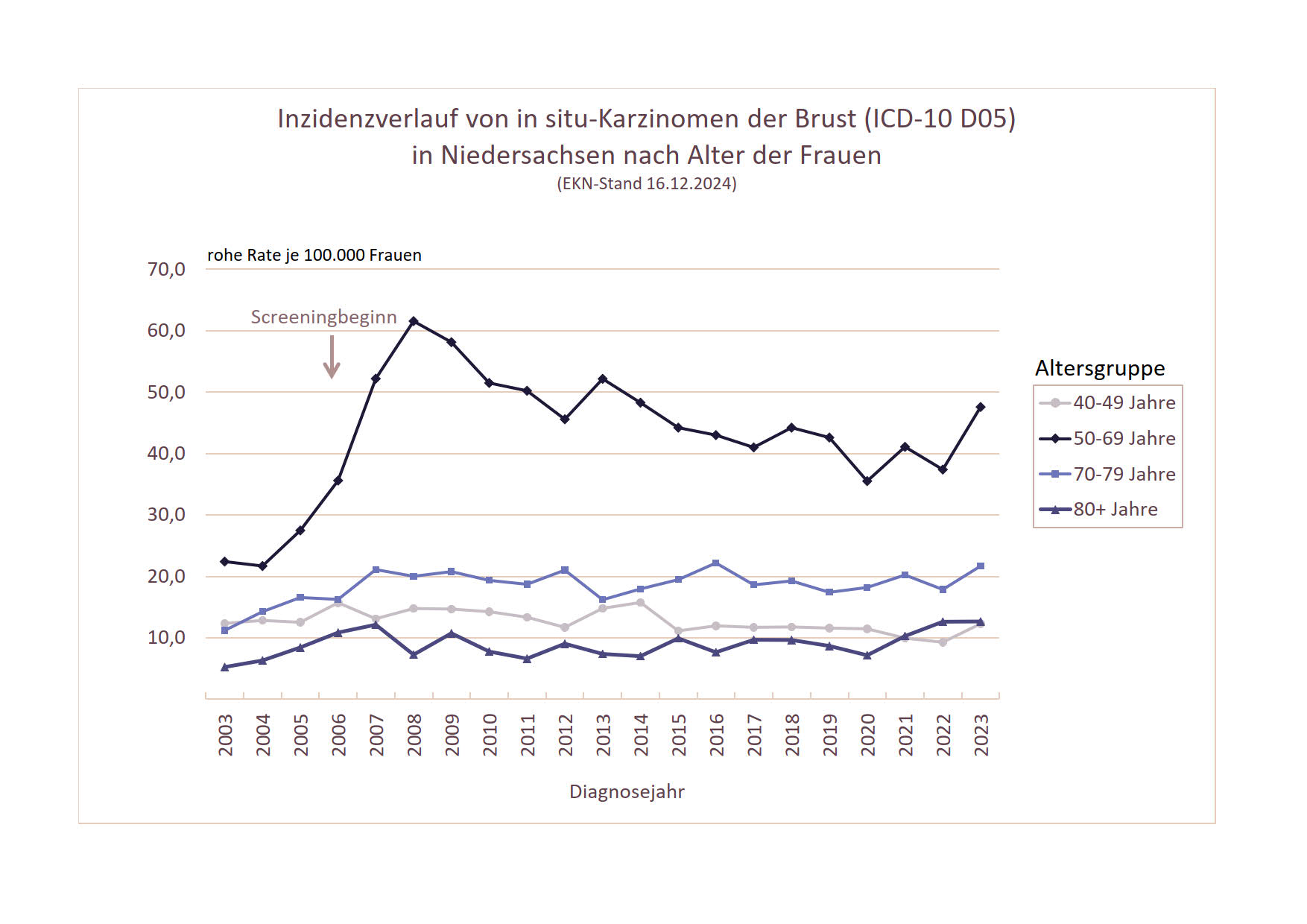 Für in situ-Karzinome der Brust zeigt sich für 50-69-jährige Frauen im Diagnosejahr 2023 weiterhin eine doppelt so hohe Inzidenzrate im Vergleich zu den Jahren vor Beginn des Screeningprogramms (s. Abbildung 2). Auch für ältere Frauen (70-79-Jährige sowie Frauen ab 80 Jahre) hat sich die Inzidenz verdoppelt, allerdings auf einem deutlich niedrigeren Niveau. Für jüngere Frauen (40-49 Jahre) bleibt sie dagegen unverändert niedrig. Ob sich in den angestiegenen Inzidenzraten für die Screeningaltersklasse der 50-69-jährigen Frauen ein Effekt von Überdiagnose durch das Screening zeigt, ist zu diskutieren. Es ist möglich, dass ein höherer Anteil dieser in situ-Karzinome zeitlebens für die Frauen klinisch nicht symptomatisch geworden wäre.