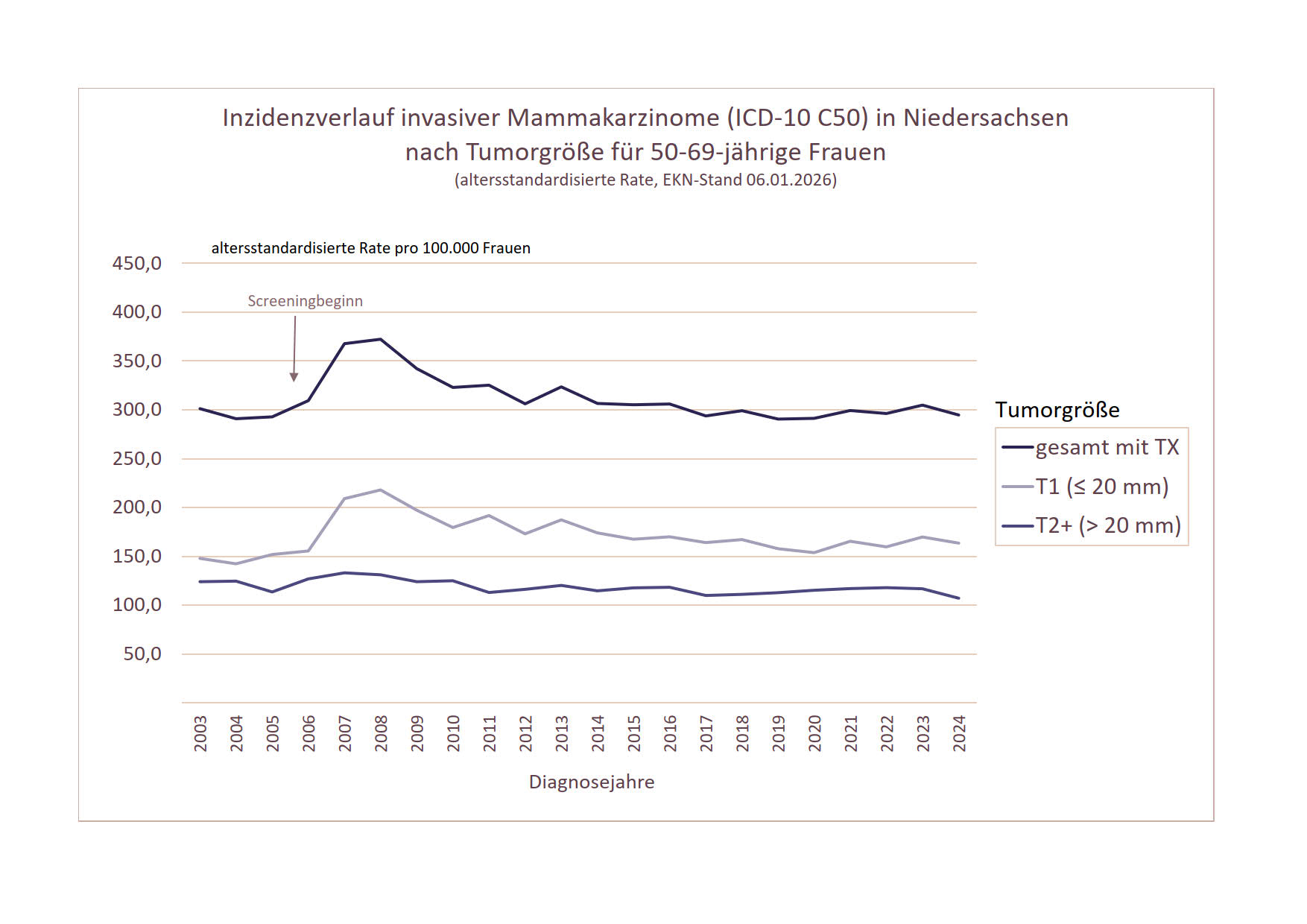 Bei der Interpretation ist zu berücksichtigen, dass auch schon vor Beginn des Mammographie-Screening-Programms ein sogenanntes ‘graues Screening’ im Rahmen der kurativen Versorgung stattgefunden hat. Die Ausgangsinzidenz vor Beginn des Screenings (Diagnosejahr 2003/2004) liegt dadurch auf einem höheren Niveau als in einer tatsächlich ungescreenten Zielbevölkerung. Außerdem wird die bevölkerungsbezogene Inzidenz von der Teilnahmerate des Mammographie-Screening-Programms beeinflusst, die in Niedersachsen bei ca. 55% liegt