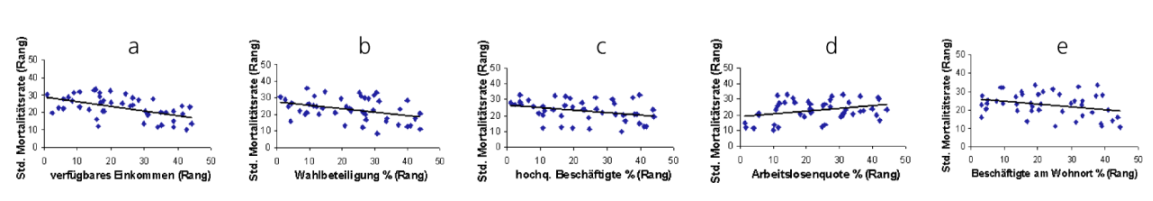 Die Ergebnisse sind in den nachfolgenden Abbildungen a, b, c, d, e dargestellt. Die stärkste signifikante Korrelation besteht zwischen verfügbarem Einkommen und Krebsmortalitätsrate (Abb. a: rs = – 53). Die Bundestagswahlbeteiligung (Abb. b: rs = – 38), hochqualifizierte Beschäftigte (Abb. c: rs = – 32), Arbeitslosenquote (Abb. d: rs = 31), sowie Beschäftigte am Wohnort (Abb. e: rs = – 30) zeigen etwas schwächere Zusammenhänge, die aber dennoch statistisch signifikant sind.