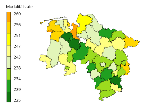 Unter Nutzung von Daten des Landesbetriebs für Statistik und Kommunikationstechnologie Niedersachsen (LSKN) wurde unter Ausschluss der Region Hannover für 45 Kreise (1995-2007) eine bivariate Korrelationsanalyse (Spearman rs) zwischen der altersstandardisierten Mortalitätsrate von Krebs insgesamt und 11 Einflussvariablen durchgeführt. Die 11 Einflussvariablen umfassen: