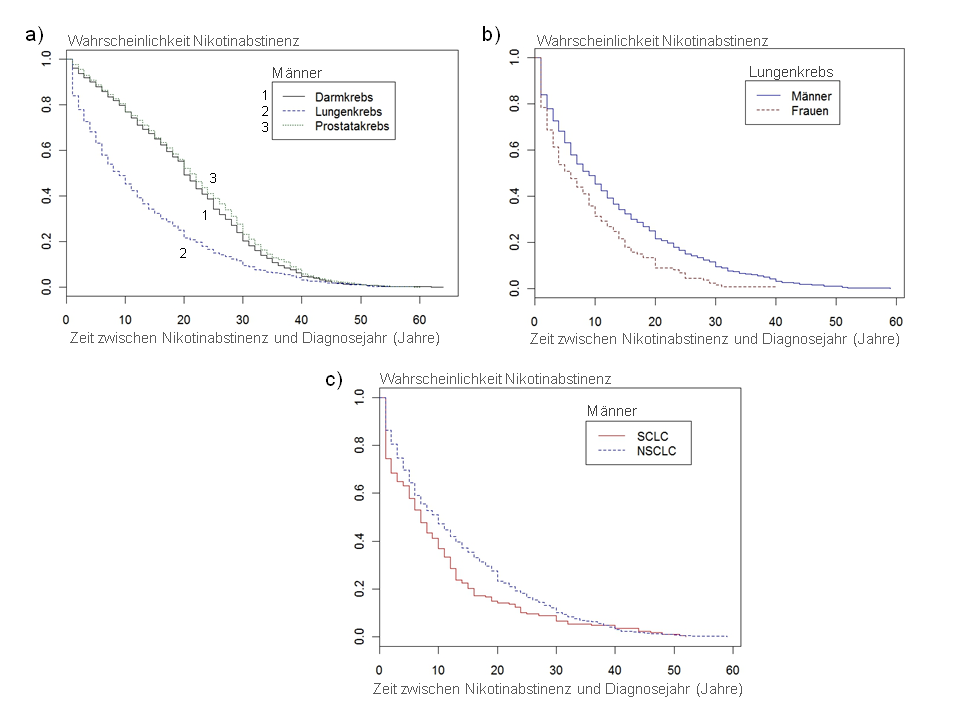 Ausgewertet wurden Primärtumoren der Diagnosejahre 1996 bis 2006, für die ein Patientenfragebogen mit Angaben zum Rauchstatus (Nichtraucher, Raucher, Ex-Raucher seit …) vorlagen. Ausgewählt wurden Ex-Raucherinnen und -Raucher, die im Jahr vor der Diagnosestellung oder früher mit dem Rauchen aufgehört haben. Die Zeitintervalle zwischen Rauchstopp und Krebsdiagnose wurden mit der Kaplan-Meier-Methode (Ereigniszeitanalyse mit dem Ereignis Krebsdiagnose und der Zeit als Jahre zwischen Nikotinabstinenz und Diagnose) dargestellt und verglichen. Unterschiede zwischen den Gruppen wurden mit dem Log-Rang-Test überprüft (Irrtumswahrscheinlichkeit = 5%).