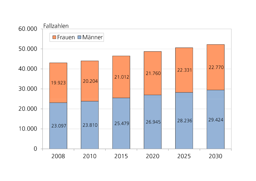 Zu den Ergebnissen: Die Zahl der Menschen, die mit einer bösartigen Neubildung (ICD-10 C00-C97 ohne C44) diagnostiziert werden, steigt von ca. 43.000 im Jahr 2008 stetig auf etwa 52.200 (plus 21%) im Jahr 2030 an (vgl. Abbildung 1)