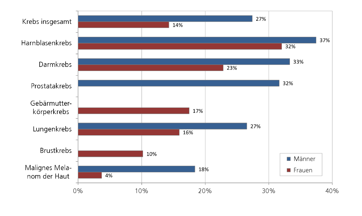 Abbildung 2 zeigt für häufige Krebsdiagnosen die Entwicklung der Neuerkrankungs-Fallzahlen in Niedersachsen mit den prozentualen Veränderungen von 2008 bis 2030. Die Zunahmen liegen bei diesen Krebsdiagnosen zwischen 10% für Brustkrebs bei Frauen und 37% für Harnblasenkrebs bei Männern. Generell sind die Veränderungen bei den Männern stärker ausgeprägt als bei den Frauen. Die Unterschiede zwischen den Krebsdiagnosen sind auf die jeweils charakteristischen altersspezifischen Inzidenzraten und das unterschiedliche mittlere Erkrankungsalter zurückzuführen. Für Krebserkrankungen mit einem höheren mittleren Erkrankungsalter wie Darm- oder Harnblasenkrebs sind auch größere Veränderungen zu erwarten.