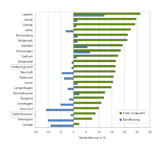 Die Kommunalstatistik der Region und der Landeshauptstadt Hannover geht in ihrer Bevölkerungsprognose für das Umland von einer leichten Bevölkerungszunahme von 2007 bis 2010 aus; bis 2020 wird insgesamt aber ein Bevölkerungsrückgang um 0,7% erwartet. Für die Landeshauptstadt wird eine etwa gleichbleibende Einwohnerzahl bis 2010 angenommen und danach ein Rückgang um 1% bis 2020 prognostiziert. Entscheidend für die Hochrechnung von Krebsneuerkrankungs-Fallzahlen ist hingegen nicht nur die Entwicklung der Gesamteinwohnerzahl, vielmehr spielt die Alterszusammensetzung der Bevölkerung eine wichtige Rolle, da das Risiko für die meisten Krebserkrankungen mit dem Lebensalter ansteigt.