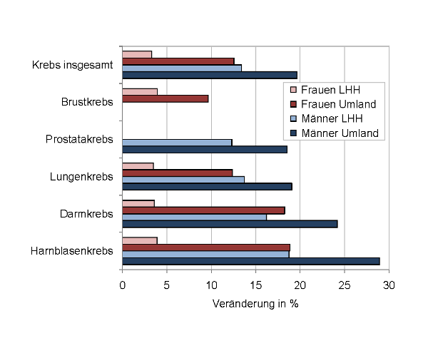 Abbildung 2 zeigt für einige häufige Krebsdiagnosen die Entwicklung der Neuerkrankungs-Fallzahlen als prozentuale Veränderungen zwischen 2007 und 2020 für die Landeshauptstadt (LHH) und das Umland Hannover auf. Die Anstiege der Fallzahlen bis 2020 sind im Umland größer als in der Landeshauptstadt Hannover und bei den Männern größer als bei den Frauen. Die größten prozentualen Zunahmen sind bei den Männern für Darm- und Harnblasenkrebs im Umland zu erwarten (+24% bzw. +29%). Die Änderungen bei den Frauen liegen in der Landeshauptstadt für alle betrachteten Krebsarten unter 5%.
