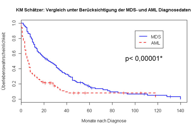 Die Analyse basiert auf 139 PatientInnen (ICD-10 C92.0, ICD-O-3 M-9895/3) aus einem Gesamtkollektiv von 476 PatientInnen, die zwischen 1993 und 2011 im EKN registriert wurden, bei denen sowohl für das MDS als auch die AML Diagnosedaten vorliegen. Das beobachtete Überleben wurde mittels Kaplan-Meier-Schätzfunktion (KM) mit dem R-Softwareprogramm berechnet (passives Follow-up bis 12.2010).