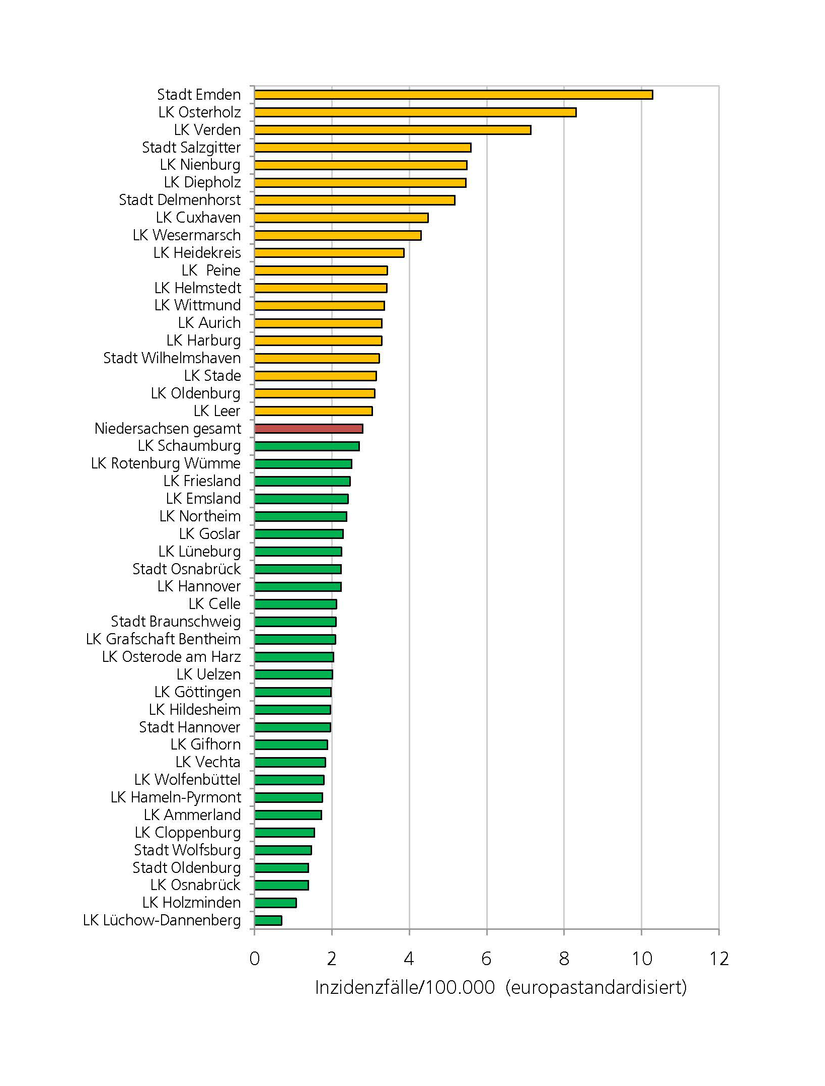 Die Inzidenzraten für Männer in den einzelnen Landkreisen in Niedersachsen bewegen sich zwischen 0,7 und 10,3 (siehe Abbildung 2).