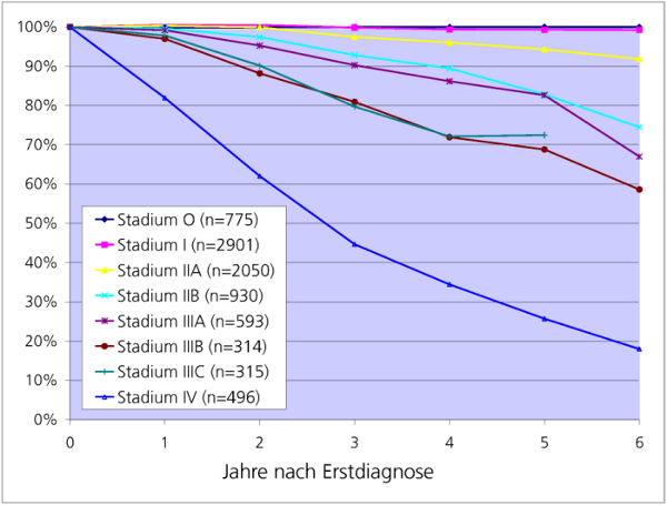 Die relativen 5-Jahres-Überlebensraten, differenziert nach UICC-Stadium (ohne unbekannte Stadien), sind in nachfolgender Abbildung dargestellt. Erwartungsgemäß ist die relative 5-Jahres-Überlebensrate bei Tumoren, die erst im Spätstadium entdeckt wurden (UICC-Stadium IV) mit ca. 26% sehr ungünstig (Tumorregister München: 25%).