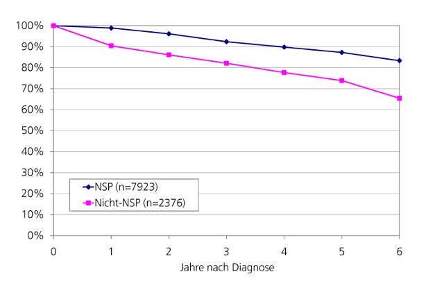 Für den Bezirk Weser-Ems wurden sämtliche vom EKN erfassten Brustkrebsneuerkrankungen (ICD-10 C50) bei Frauen im Diagnosezeitraum 2001 – 2006 dahingehend unterschieden, ob sie über die NLST an das EKN gemeldet worden sind oder nicht (NSP vs. Nicht-NSP). Verglichen wurden die relativen Überlebensraten zwischen beiden Gruppen. Beim Vergleich der relativen Überlebensrate wiesen die in der organisierten Nachsorge betreuten Patientinnen bessere relative Überlebensraten auf als die Nicht-Nachsorge-Patientinnen, wie die Abbildung zeigt. Neben einem möglicherweise positiven Effekt durch die Nachsorge sind aber auch Selektionsfehler wie z. B. Unterschiede in der Altersstruktur, in der Tumorstadien-Verteilung und in der Datenqualität sowie andere Confounder als Einflussfaktoren zu diskutieren.