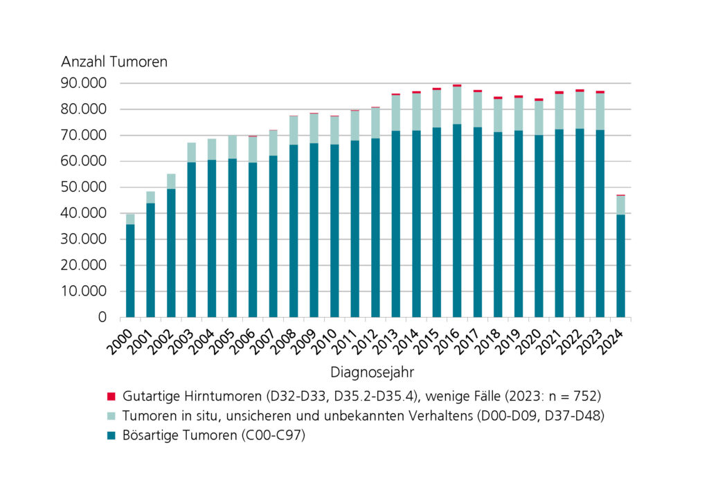 Die folgende Abbildung zeigt die Anzahl der registrierten bösartigen Primärtumoren (ICD-10 C00-C97 inkl. nicht-melanozytärem Hautkrebs C44), der gemeldeten Tumoren in situ und unsicheren bzw. unbekannten Verhaltens (ICD-10 D00-09, D37-D48) sowie der gemeldeten gutartigen Hirntumoren (D32-D33, D35.2-D35.4) nach Diagnosejahren in Niedersachsen.