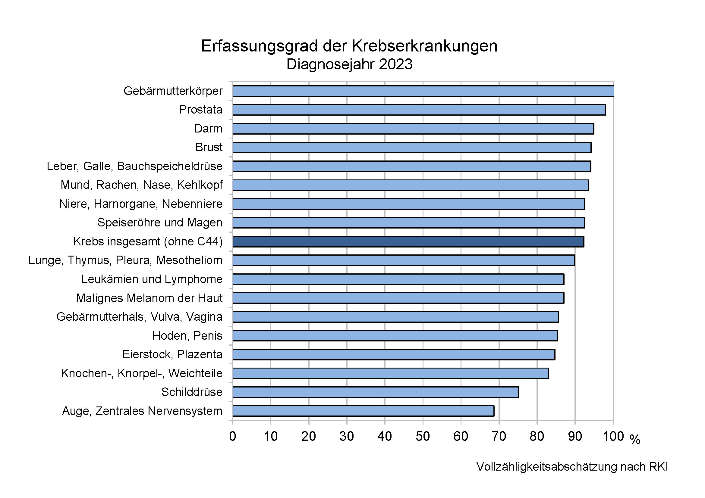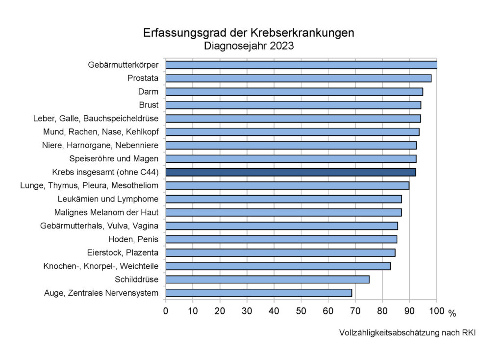 Abbildung: Erfassungsgrad für verschiedene Krebserkrankungen und Krebs insgesamt in Niedersachsen für das Diagnosejahr 2023.